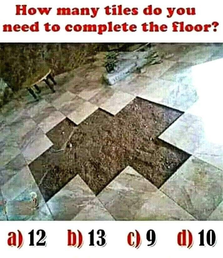 Take a close look at the broken section of the tiled floor below. The missing area has an irregular shape that can easily trick your eyes. Your task is simple: count how many tiles are needed to completely fill the gap.